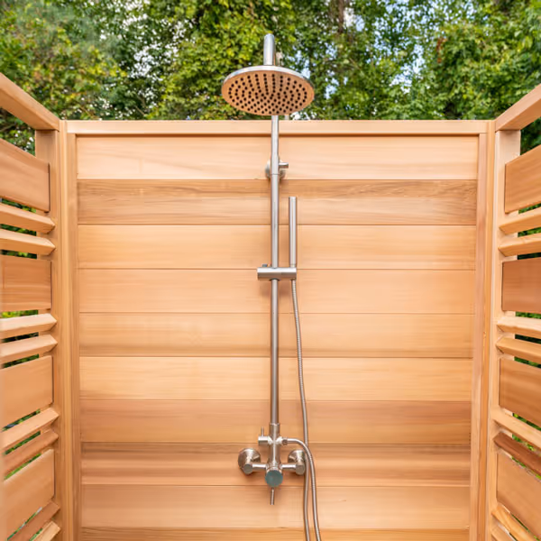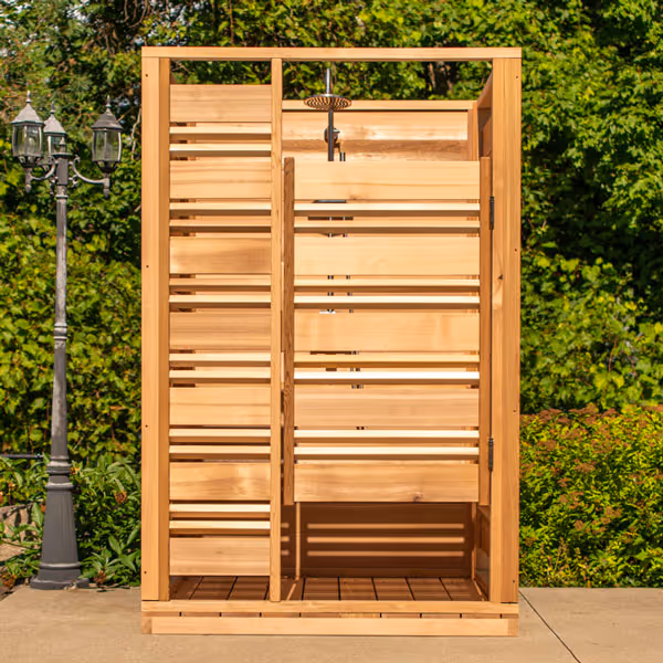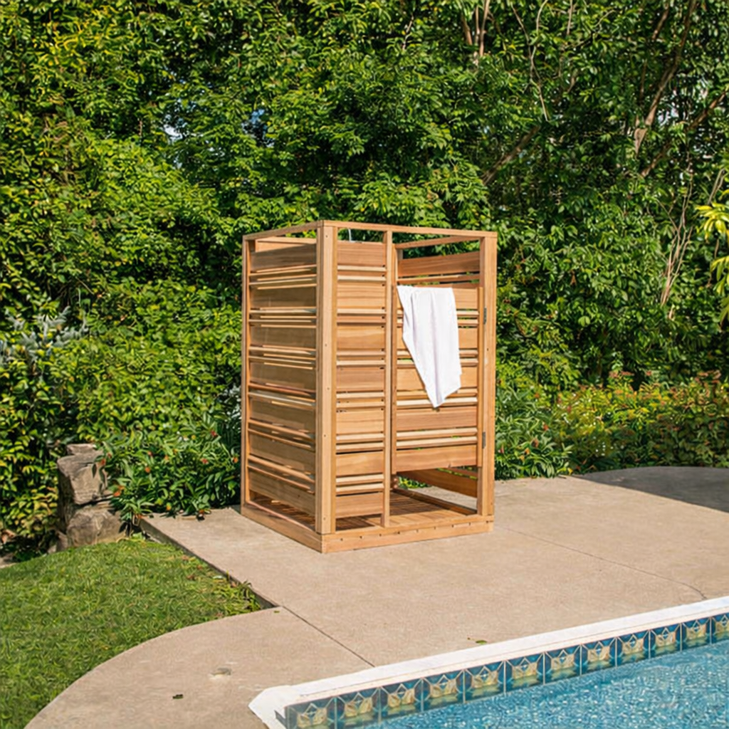 The Cloudburst Outdoor Shower Enclosure is an elegant freestanding red cedar shower cubicle with an enclosed privacy wall and door. Designed for outdoor use, it provides a practical and private space to cool off at the end of a sauna session.