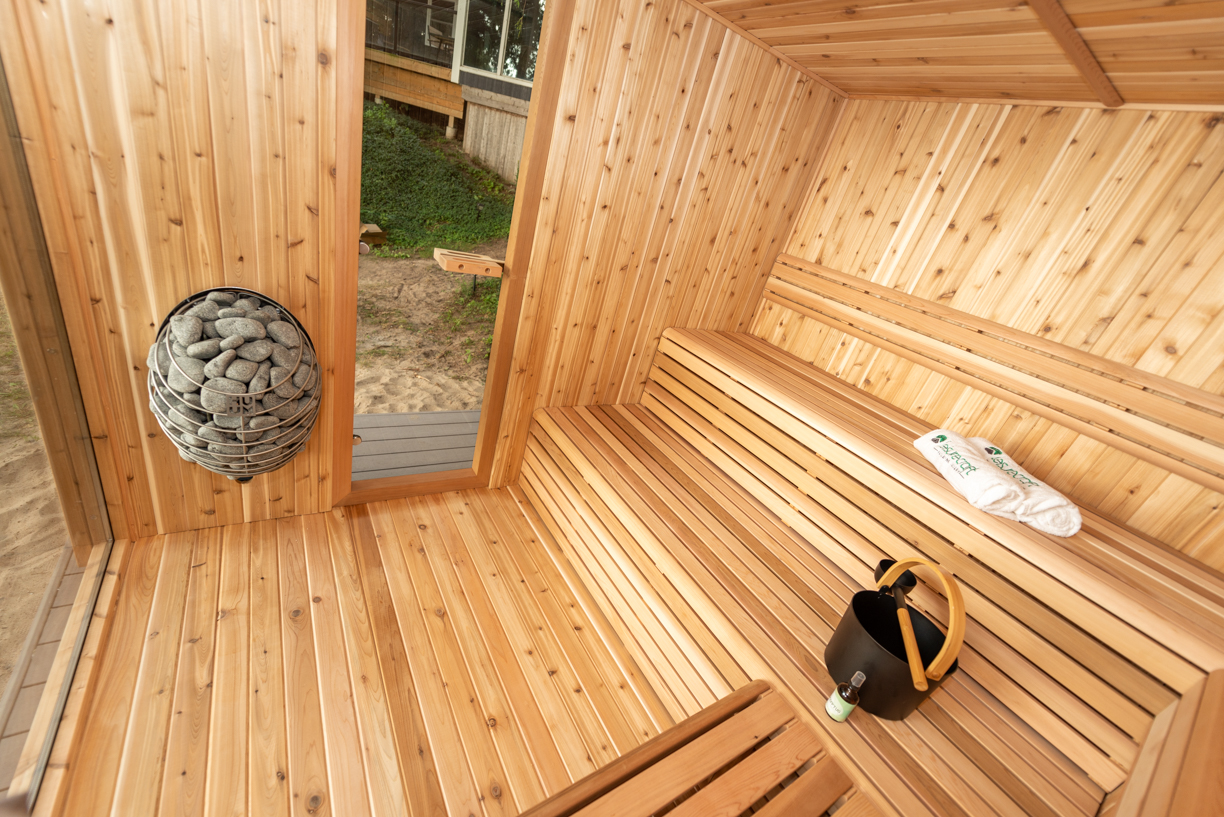 Like the Orion, the Neptune Sauna is designed with both performance and aesthetics in mind. A single large pane double glazed front creates a strong visual connection to the surrounding environment whilst maintaining excellent heat retention.