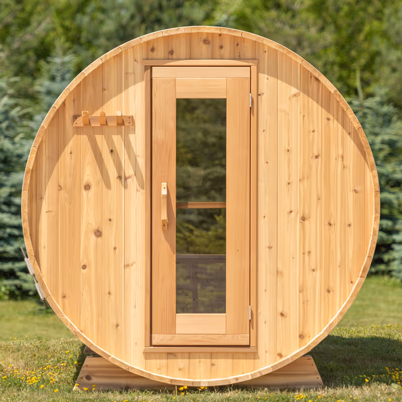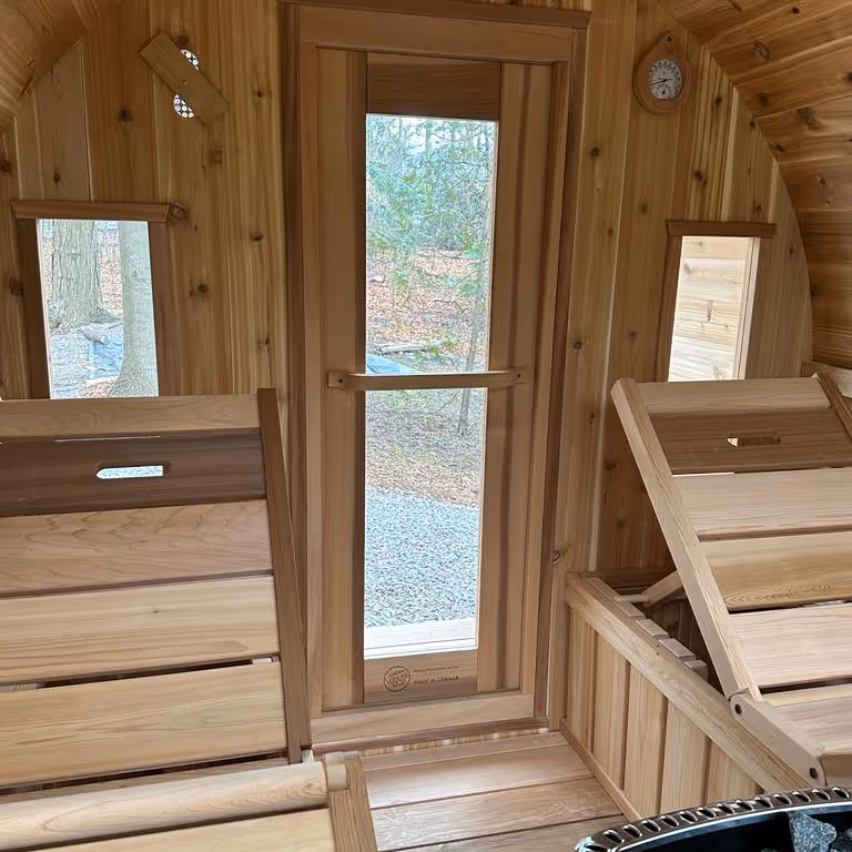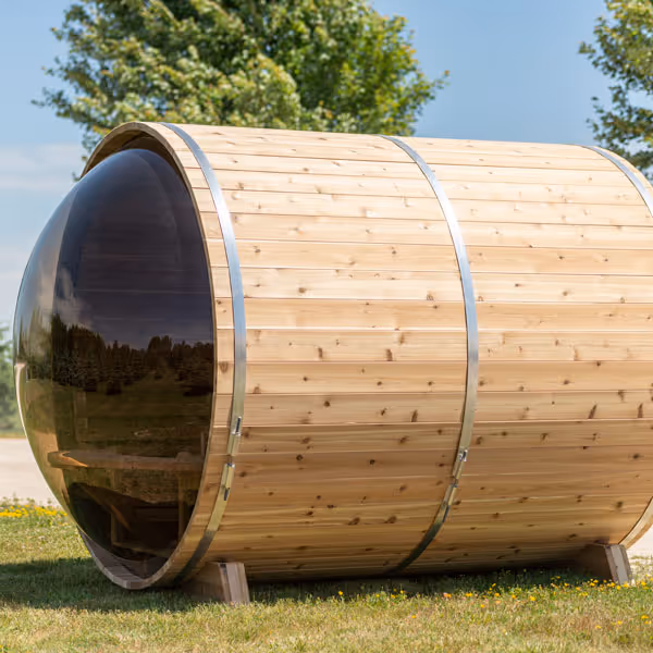 The Panoramic Barrel Sauna is designed to create a warm, enveloping sauna experience with a strong connection to its surroundings.
