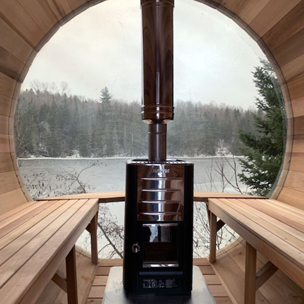 Constructed from Western Red Cedar with 38 mm thick single piece cedar staves, the barrel design provides natural structural strength and the reduced volume means greater heat efficiency. A panoramic plexiglass domed end opens the sauna to the outdoors bringing the outdoors in – available with a free standing or wall mounted heater with options for our Signature curved benches or adjustable lounger benches.
