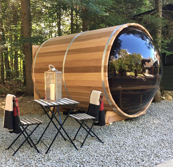 Constructed from Western Red Cedar with 38 mm thick single piece cedar staves, the barrel design provides natural structural strength and the reduced volume means greater heat efficiency. A panoramic plexiglass domed end opens the sauna to the outdoors bringing the outdoors in – available with a free standing or wall mounted heater with options for our Signature curved benches or adjustable lounger benches.