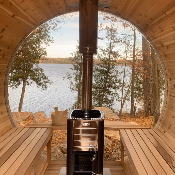 The Panoramic Barrel Sauna is designed to create a warm, enveloping sauna experience with a strong connection to its surroundings.