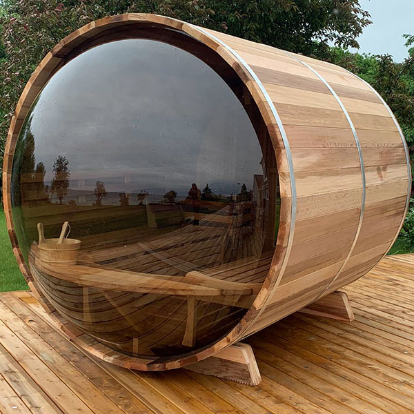 Constructed from Western Red Cedar with 38 mm thick single piece cedar staves, the barrel design provides natural structural strength and the reduced volume means greater heat efficiency. A panoramic plexiglass domed end opens the sauna to the outdoors bringing the outdoors in – available with a free standing or wall mounted heater with options for our Signature curved benches or adjustable lounger benches.